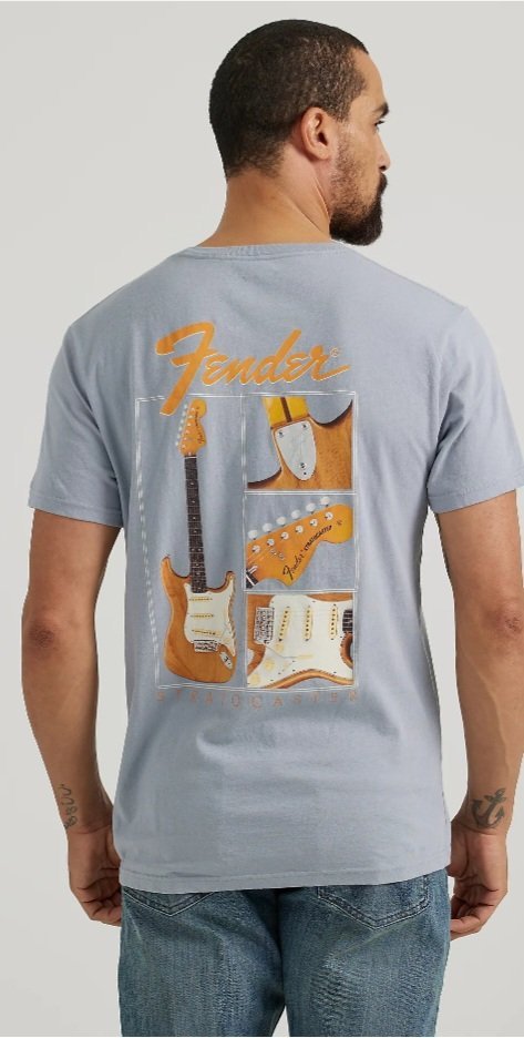 The real star of the show’s the T-shirt itself. On the back, there’s this awesome graphic that screams Fender vibes. The word “Fender” is written in bold, orange cursive letters at the top β instantly recognizable for any guitar enthusiast or music lover out there πΈ. Below the logo, there’s a collage of three different views of a Fender guitar. The guitar’s got that classic look with a light brown body, a white pickguard, and a dark brown neck. The details on the guitar graphics are on fleek β you can see the headstock with those tuning pegs, the body shape’s spot on, and even the Fender signature on the pickguard looks legit π₯.