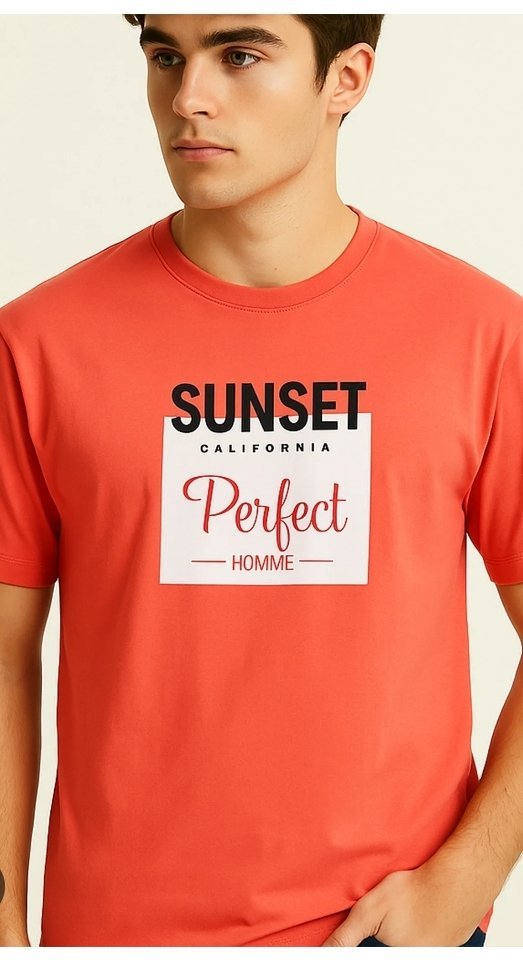 – Text: “SUNSET” (black, top), “CALIFORNIA” (smaller black text below “SUNSET”), “Perfect” (red cursive), “HOMME” (red, below “Perfect” with lines on either side).