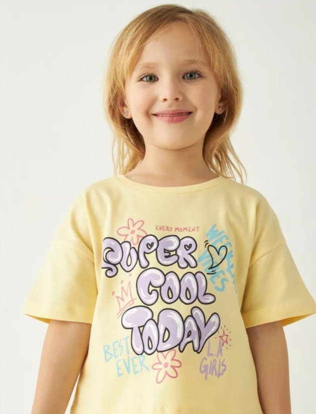 The image radiates a burst of youthful energy and positivity, capturing a little girl embodying the essence of a “Super Cool Today.” She’s wearing a pastel yellow t-shirt that instantly evokes feelings of warmth and sunshine, perfect for a bright day filled with smiles.