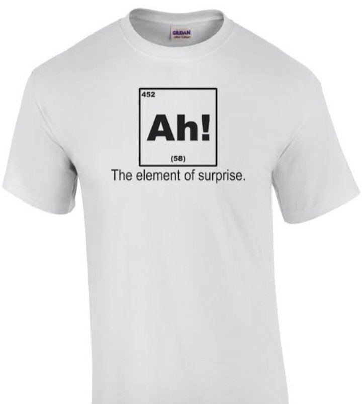 – The tee features “Ah!” in a periodic table-style box, labeling it “The element of surprise.”
