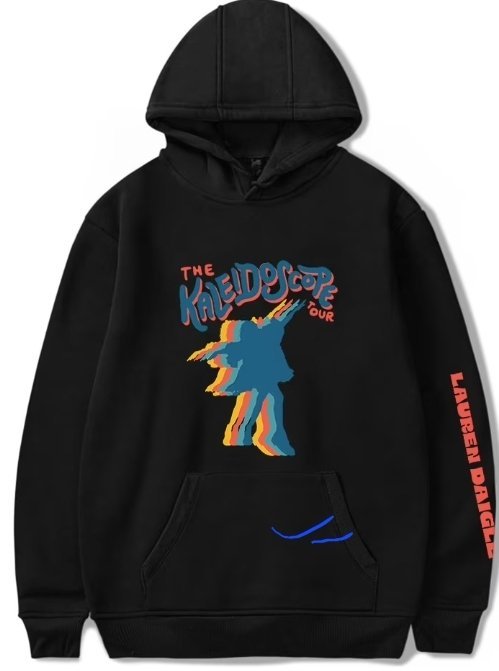 It’s a black hoodie with a graphic on the front featuring a blue silhouette of a person dancing with arms outstretched. The silhouette has orange and yellow highlights. Above the silhouette, “THE KALEIDOSCOPE TOUR” is written in blue and red stylized text. On the right sleeve, “LAUREN DAIGLE” is printed vertically in orange text. The hoodie has a front pocket and is set against a plain white background.