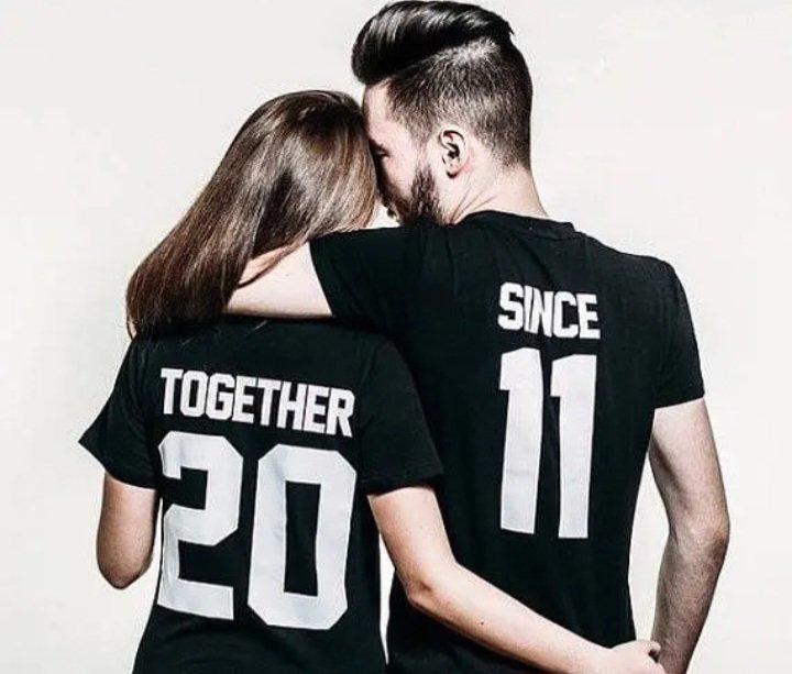 Their black t-shirts are the focal point of the image, each bearing significant text in bold white letters. On the woman’s shirt, “TOGETHER” is written above a large “20”, likely indicating the year they started their journey together. On the man’s shirt, “SINCE” is written above a large “11”, probably referencing the month (November) they began their relationship. This clever design on their matching tees symbolizes their bond and the start of their story.
