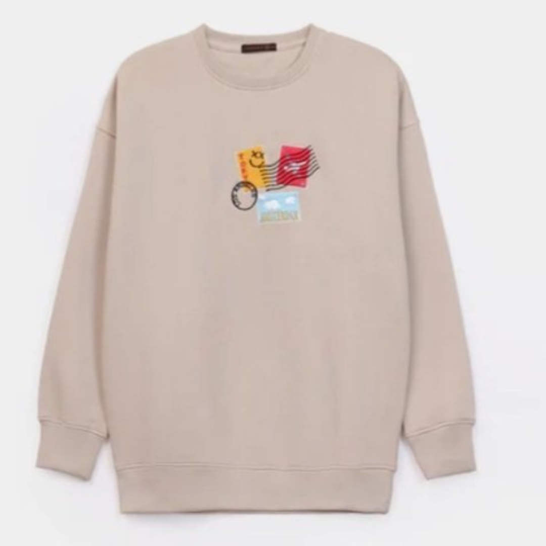 The graphic on the sweatshirt seems to evoke a sense of fun and creativity, maybe hinting at a love for travel, different cultures (“flags” element), or just a general love for colorful, playful designs. The beige base keeps the look grounded and versatile, while the graphic adds a pop of personality.