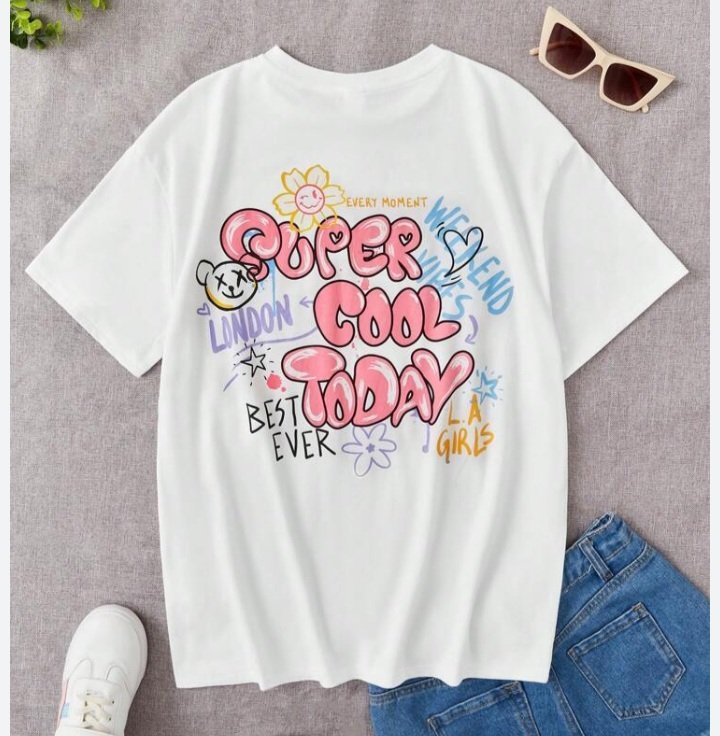 At the heart of the design, bold pink bubble letters scream “SUPER COOL TODAY” amidst a flurry of doodles and fun phrases like “EVERY MOMENT WE FRIEND,” “LINDON,” “BEST EVER,” and “LA GIRLS.” These words are scattered in a circular pattern around the central phrase in a mix of pastel colors like blue, purple, yellow, and pink, adding to the tee’s lively vibe. Cute doodles of flowers, stars, hearts, and a smiling bear face enhance the playful aesthetic, making the shirt perfect for someone who loves expressing their fun side.