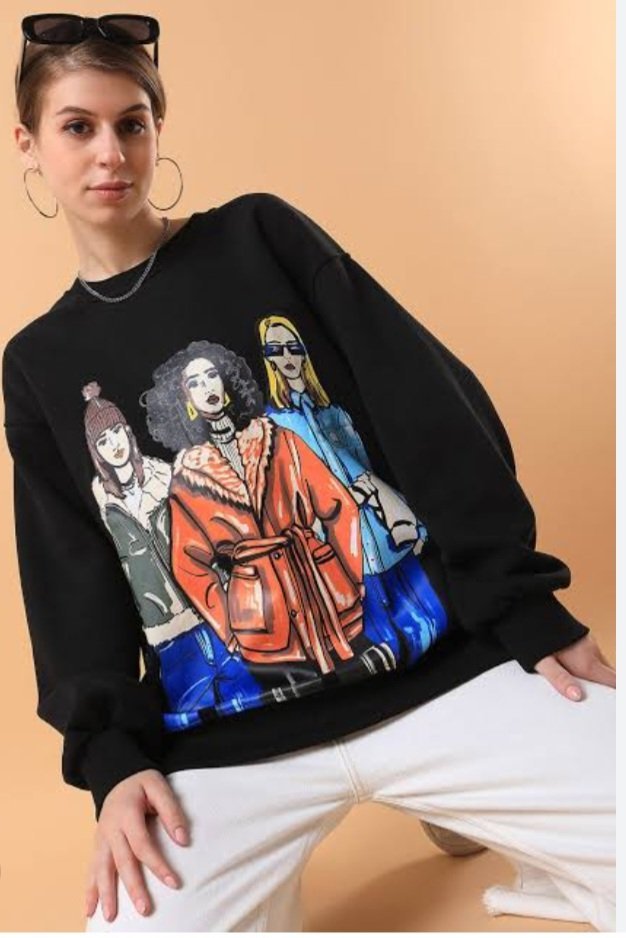 The design’s attention to detail, from the textures hinted at in the graphic (like the fur on the orange coat) to the expressive faces of the women, adds depth to the sweatshirt’s aesthetic. It’s a piece that blends artistry with everyday wear, appealing to those who value unique fashion that reflects personality.