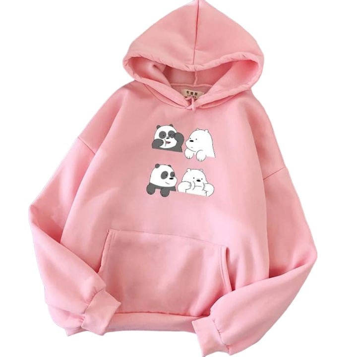 This is a pink hoodie featuring cartoon graphics of the three characters from We Bare Bears – Grizz, Panda, and Ice Bear. The characters are depicted in two rows, with Grizz and Panda in the top row looking at Ice Bear, and Panda and Ice Bear in the bottom row looking at Grizz. The hoodie has a front pocket and a hood with a drawstring (not visible). It’s laid out flat on a white background.