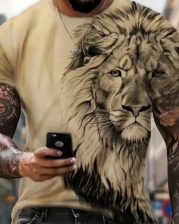 The tee is a black, short-sleeved T-shirt featuring a striking graphic design. On the upper part of the shirt, there's an image of a cute white kitten with blue eyes and grey stripes walking on a wet surface. Below the kitten's image, its reflection in the wet surface transforms into a fierce-looking tiger with a similar pattern, creating a paradoxical and eye-catching contrast between innocence and power.