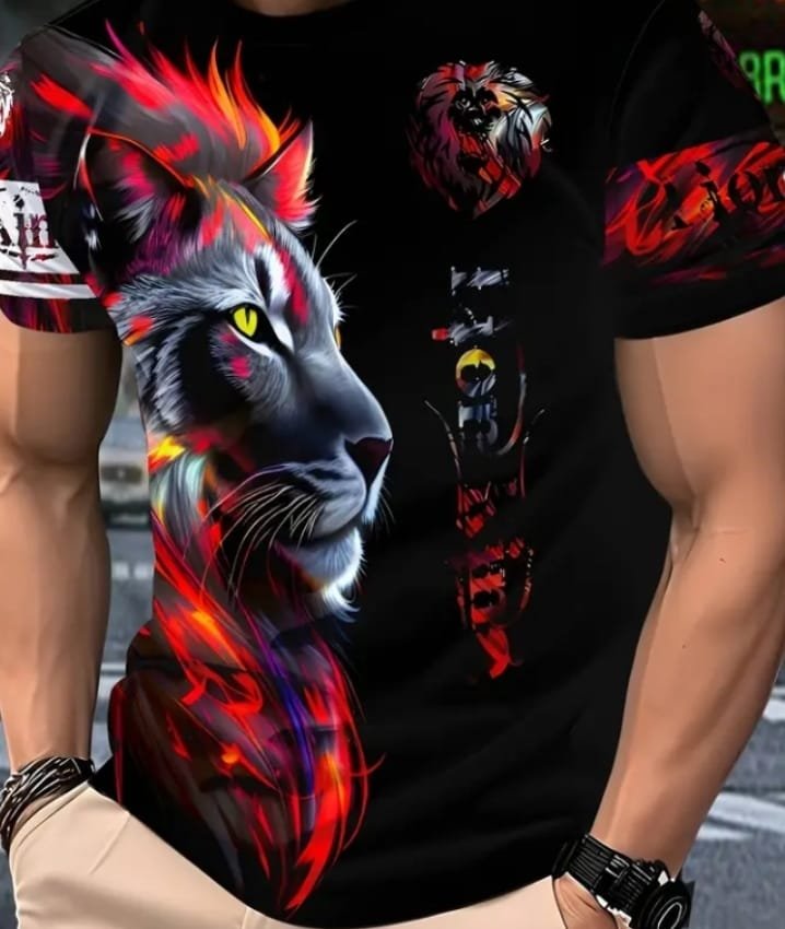 The “Wolfstorm” tee is a black graphic t-shirt featuring a striking, digitally illustrated wolf’s head with vibrant, fiery accents. The wolf’s head is depicted in profile on the front of the shirt, showcasing yellow eyes, sharp facial features, and a mane infused with red, orange, and purple hues that evoke a sense of intense energy. Additional wolf graphics are present on the shirt: a smaller wolf head above the main graphic and a vertical strip of wolf silhouettes below. The sleeves have partial graphics with bold colors and text elements. The tee is worn by a person accessorized with a black watch and bracelets, standing against a blurred urban background.